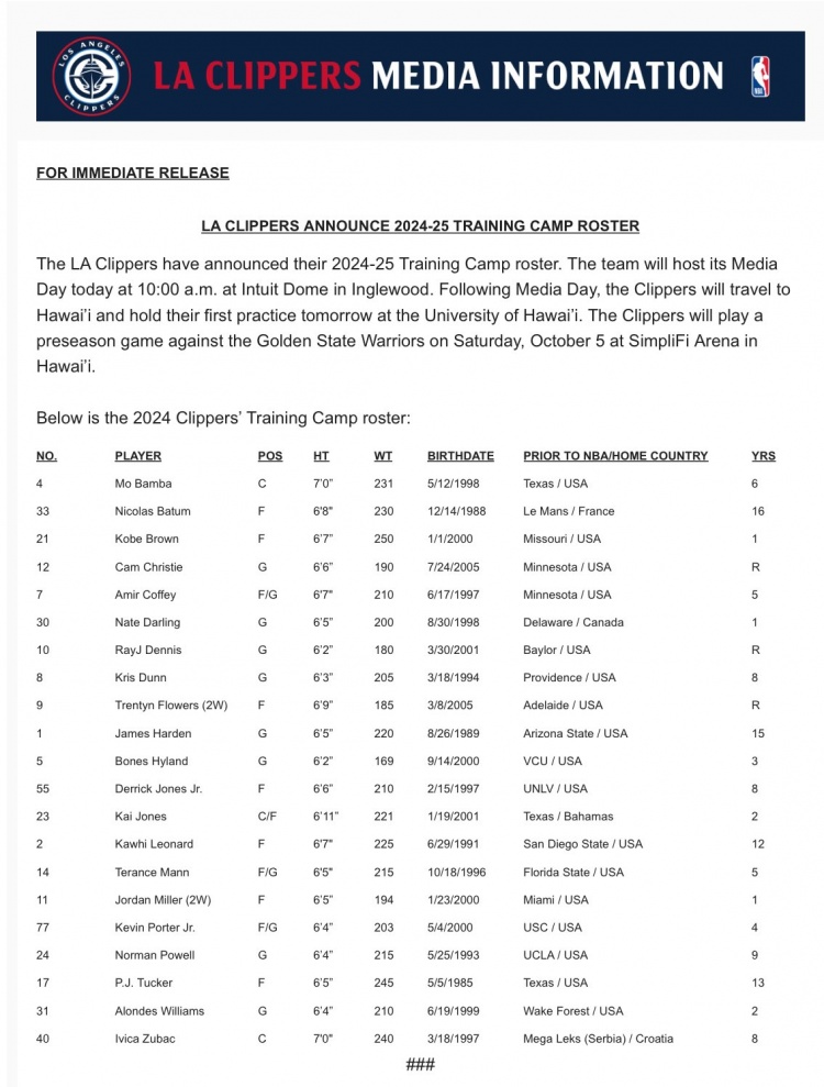 今日,快船公布了新赛季训练营阵容,名单如下。