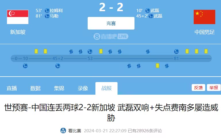 而就在本届世预赛,国足客场战新加坡,在2-0领先的情况下被连扳两球逼平。