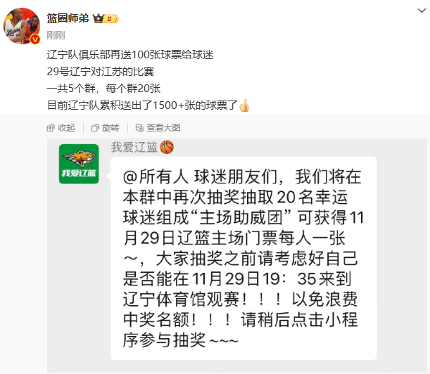 “辽宁队俱乐部再送100张球票给球迷,29号辽宁对江苏的比赛,一共5个群,每个群20张,目前辽宁队累积送出了1500+张的球票了。”