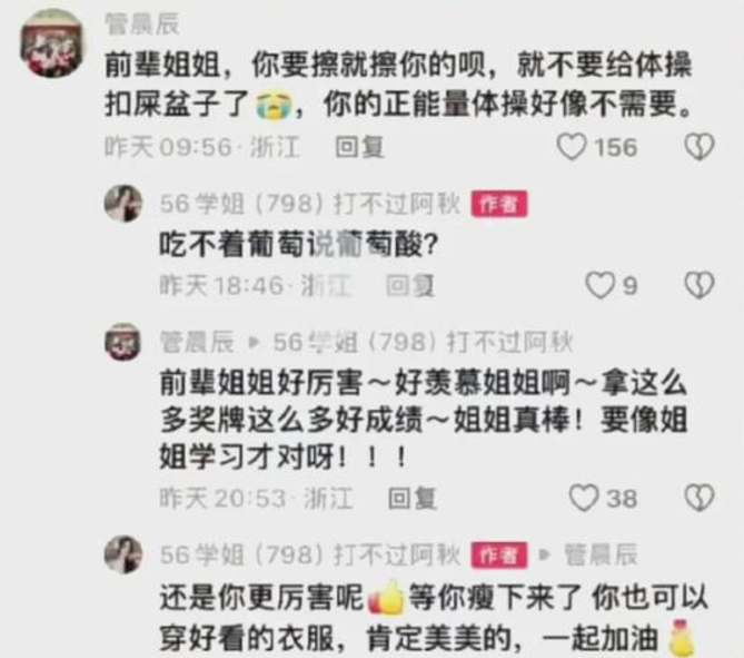 而在此之后,有网有了解到管晨辰在退役后也成为了一位视频博主,她的账号下同样也有许多跳舞视频。部分网友就此找到管晨辰的社媒账号,并留下大量为吴柳芳打抱不平以及部分攻击管晨辰的言论。