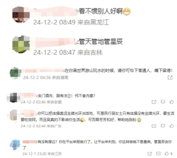 雷速体育12月2日讯 此前举报吴柳芳视频“擦边”的前奥运冠军管晨辰近日遭到大量网友攻击,许多人在她的账号下留言,为吴柳芳打抱不平。