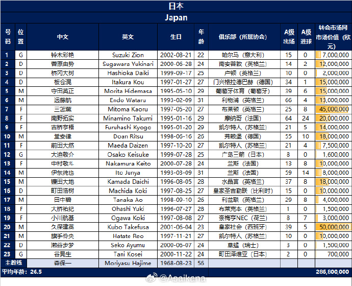 日本队身价超1000万欧球员